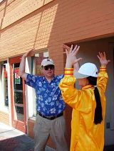 四月的格林威利春风和煦、丽日融融,在市中心Bergamo广场上国际太极气功节正式开始。法轮功功法被安排在第一个和最后一个出场表演。法轮功学员的方阵第一排为身着仙女装者演示静功打坐,其后三排为身着金黄色炼功服者演示动功。中午暖暖的阳光照射在金黄色的炼功服上,与大法弟子的超然神采交相辉映。