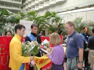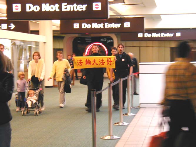 杰瑞德于二零零二年二月十四日前往中国北京和平请愿,返抵美国时,在机场受到法轮功之友的热烈迎接。