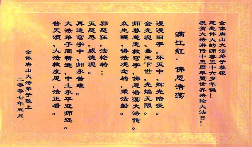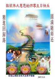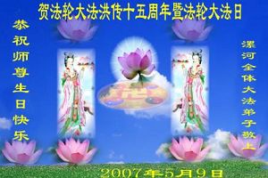 【明慧网二零零七年五月十二日】陕西省安康市大法弟子、黑龙江省大法小弟子、福建武夷山全体大法弟子、河南省漯河三区(源汇区、郾城区、召陵区)二县(临颍县、舞阳县)大法弟子、北京天坛、龙潭地区大法弟子、宁夏灵武市大法弟子、德惠大法弟子、四川省内江市全体大法弟子、吉林省公主岭市一家三代大法弟子、黑龙江省汤原县全体大法弟子、吉林省公主岭市大法弟子、辽宁省辽阳大法弟子、辽宁营口市大法弟子、全体青州、临朐大法弟子、全体潍坊大法弟子、山东临朐全体大法弟子、鲁西南全体大法弟子、江苏省太仓市全家大法弟子、荣县及所有乡镇全体大法弟子、湖南省衡阳市全体大法弟子、营口市鲅鱼圈区全体大法弟子、湖北赤壁市全体大法弟子、云南全体大法弟子、山东梁山全体大法弟子、湖北省咸宁大法弟子、西安大法弟子、郫县全体大法弟子、福建(古田、屏南、周凝)大法弟子、莱芜大法弟子、深州市大法弟子、山东武城大法弟子、广州全体大法弟子、潍坊市坊子区大法弟子一家六口、宁波大法弟子、湖南省娄底市大法弟子、辽宁营口鲅鱼圈地区全体大法弟子、广东揭西全体大法弟子、陕西省大荔县大法弟子、西安市大法弟子、河北省保定市大法弟子、河南许昌市全体大法弟子、山东临朐县全体大法弟子、山东平原县全体大法弟子、重庆市涪陵区大法弟子、宁波地区全体大法弟子、佳木斯、双鸭山大法弟子、河北定州大法弟子、山东郓城大法弟子、临朐县青州市全体大法弟子、全体汕尾市海陆丰大法弟子、安徽大法弟子、山东单县全体大法弟子、淄博市临淄区大法弟子、陕西省宝鸡地区全体大法弟子、河北省唐山南堡开发区全体大法弟子、彰武大法弟子、湖北武汉东西湖区全体大法弟子、北京朝阳、顺义大法弟子、北京市石景山区和门头沟区全体大法弟子、甘肃嘉峪关全体大法弟子、南昌市郊区大法弟子一家三口、陶然亭、洋桥、虎坊桥、右安门大法弟子、山东武城大法弟子、四川大邑全体大法弟子、福建省福州市全体大法弟子、河北廊坊大法弟子、河北省巨鹿县大法弟子、辽宁兴东全体大法弟子、安徽省宿州市大法弟子、安徽省萧县大法弟子、安徽省砀山县大法弟子、安徽省皖北煤矿矿区大法弟子、大连市中山区大法弟子、安徽省淮北市、濉溪县两地区全体大法弟子、黑龙江省友谊县大法弟子、济南天桥区大法弟子、沈阳铁西森林公园的大法弟子、福建莆田全体大法弟子、河北景县全体大法弟子、湖北沙市全体大法弟子、黑龙江省依兰县达连河大法弟子、恩平市全体大法弟子、大庆大法弟子、山东冠县全体大法弟子、黑龙江流离失所大法弟子、山东莱州农村大法弟子、沧州大法弟子、忻州大法弟子、十堰市大法弟子、博野县家庭资料点全家七名大法弟子及全村大法弟子、辽宁东港市大法弟子、莱西市全体农村大法弟子、米易县全体大法弟子、珠海大法弟子、河北省滦县全体大法弟子、南平地区大法弟子、济南历城大法弟子母女、湖北省云梦县全体大法弟子、武汉市新洲大法弟子、辽宁抚顺大法弟子、浙江台州大法弟子、河北省清苑县全体大法弟子、江西大法弟子、台前大法弟子、武阳城全体大法弟子、湖北大法弟子、山东冠县全体流离失所大法弟子、武汉市新洲区大法弟子、北京海淀区二里庄大法弟子、北京市朝阳区双井地区大法弟子、北京市朝阳区南湖中园大法弟子、温州市全体大法弟子、宁夏流离失所的大法弟子、宁夏银川全体大法弟子、宁夏被非法关押的大法弟子、黑龙江省依兰县达连河大法弟子、辽宁省抚顺市新宾县全体大法弟子、贵州安顺全体大法弟子、安徽省宿州市第三监狱被非法关押的大法弟子、被关押在河北女子监狱受迫害的法轮大法弟子、被非法关押在长春市黑嘴子劳教所2大队的大法弟子、被非法关押在重庆市女子劳教所的全体大法弟子恭祝师尊五十六华诞暨大法洪传十五周年!热烈庆祝世界法轮大法日!