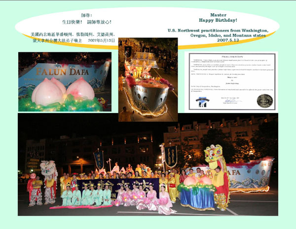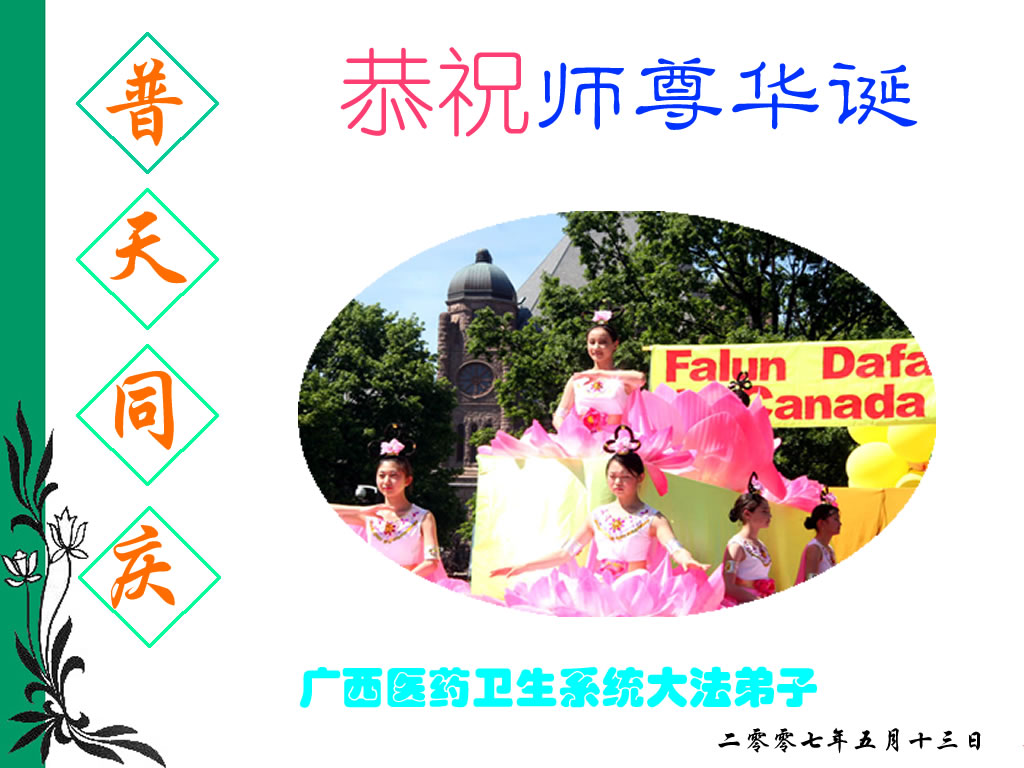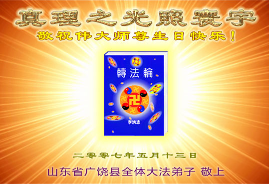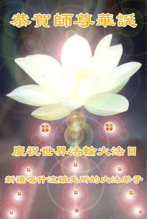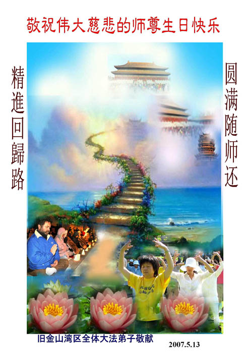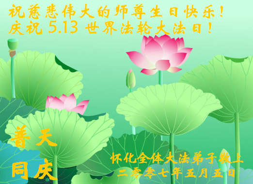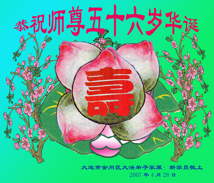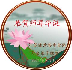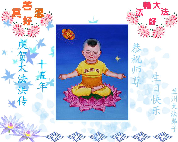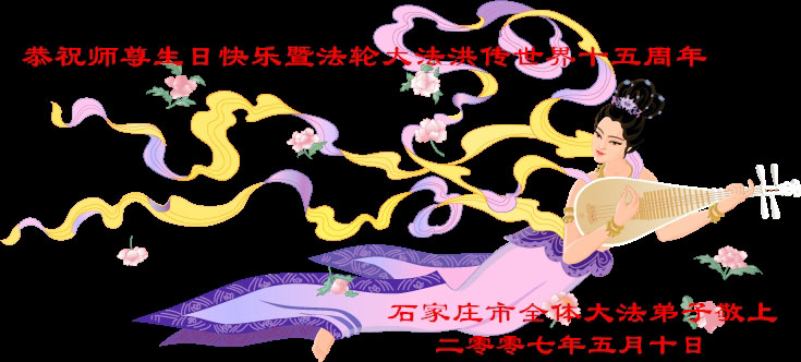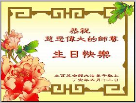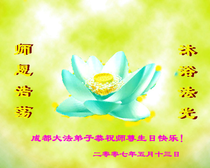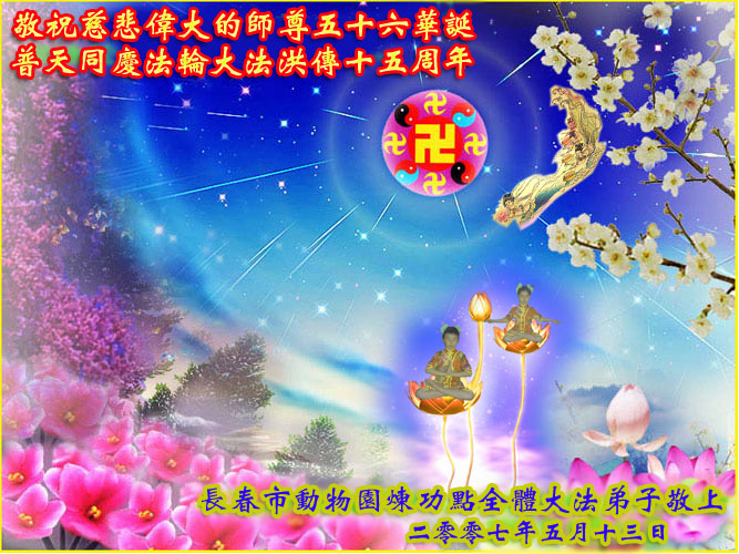 转眼又是一年,大法弟子又迎来了二零零七年的五月十三日―――师尊的生日。在此我们全家向伟大的师尊问好,敬祝师尊生日快乐!请师尊放心,我们一定多学法,完成好大法弟子的三件事,不辜负师尊的慈悲苦度!