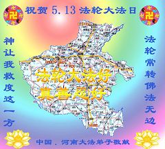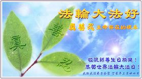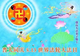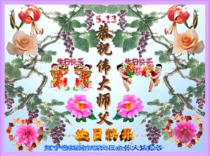 五一三──全球法轮大法日,又是师父的诞辰日,在这喜庆的日子里,我们虽不能像国外大法弟子那样庆祝,但我们的心是相连,恶党永远动不了我们坚如磐石的心,师父请您放心,我们坚决按您的要求去做,事事对照法,做好三件事。