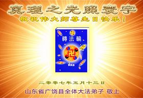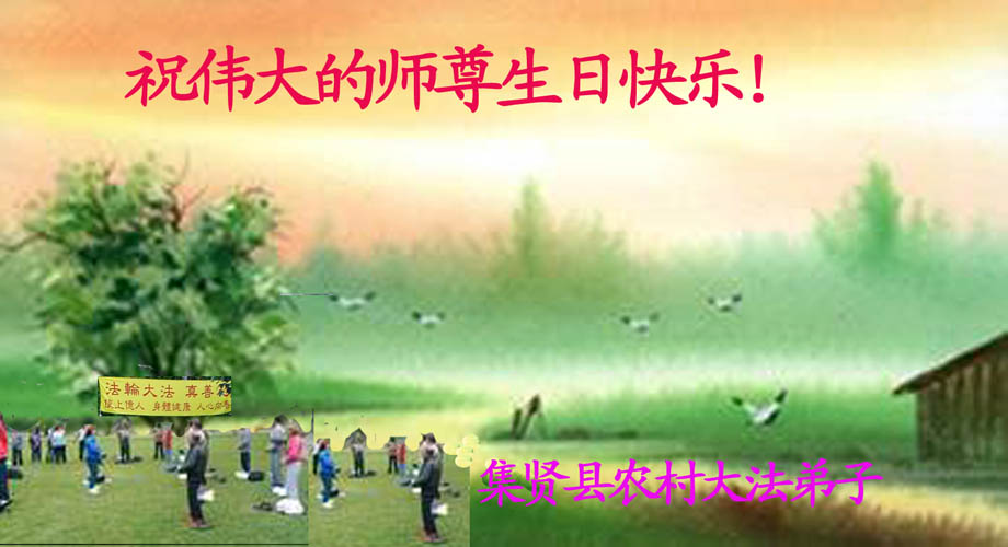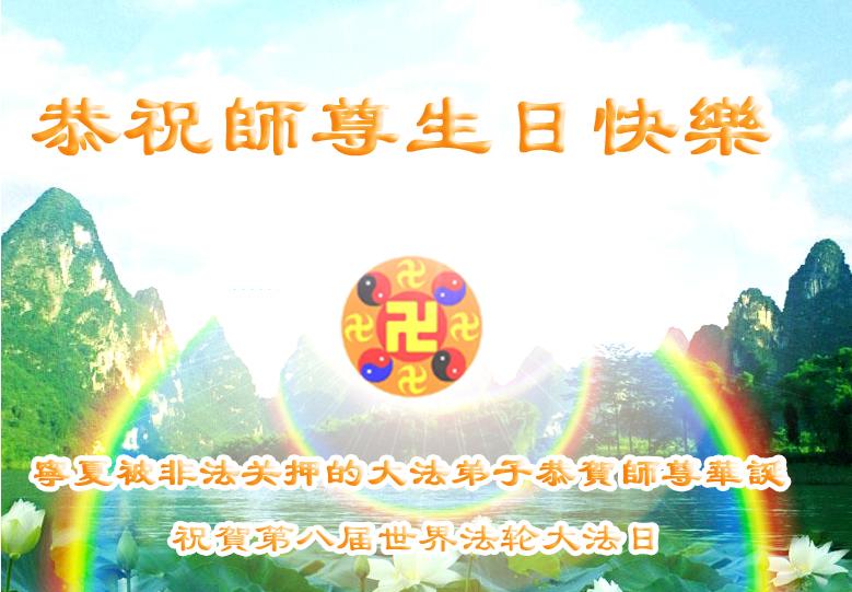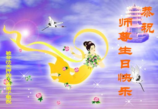 被监禁在团河劳教所三大队的全体大法弟子、被非法关押在青岛大山看守所的大法弟子、嘉兴市全体被非法判刑关押的大法弟子、太仓狱中大法弟子、宁夏灵武市在监狱被迫害的大法弟子、被非法关押于沈阳监狱城一监狱的全体大法弟子、浙江丽水看守所非法关押的全体大法弟子、浙江龙泉看守所非法关押的全体大法弟子、北京市、天津市、深圳市被非法羁押在看守所、劳教所、监狱、洗脑班等地的大法弟子恭祝师尊五十六华诞暨大法洪传十五周年!热烈庆祝世界法轮大法日!