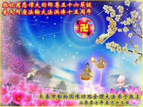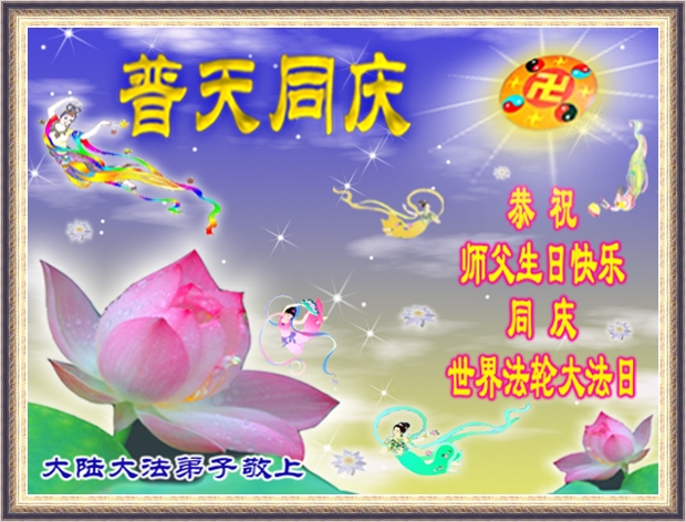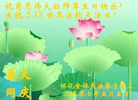一九九二年五月十三日,师尊将大法洪传于世,弟子有幸在您的呵护下走上回归的路。五月十三日——世界法轮大法日,世人从此有了得救的希望!在普天同庆世界法轮大法日的时刻,弟子们更加想念师尊,感谢师尊的救度之恩!弟子们会更加努力精進,在助师正法的路上走的更加稳健。恭祝师尊生日快乐!颂祝世界法轮大法日!