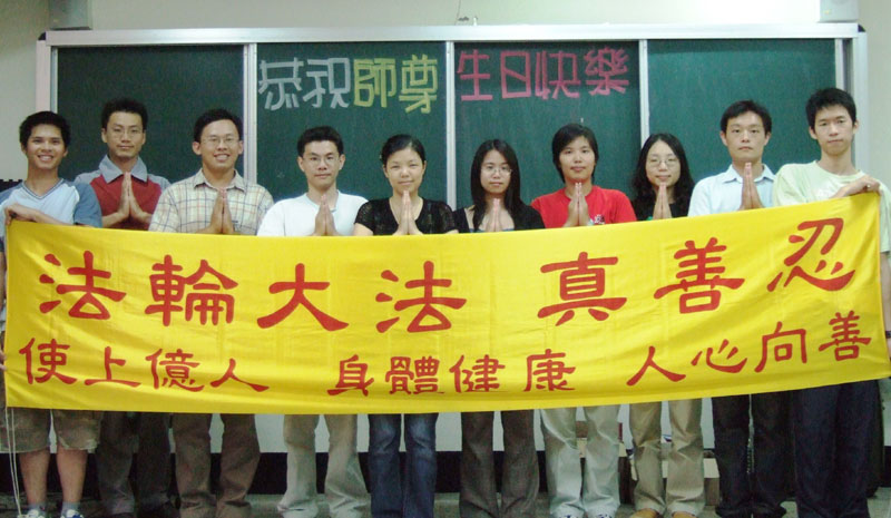 二零零七年五月八日中午,台湾国立中山大学修炼法轮功的青年学子聚集起来,为的是一齐向他们心中尊敬的李洪志老师祝寿。他们希望将拍下的这张照片,传送到美国给李老师以恭祝师尊生日快乐,并表达他们愿意踏踏实实走好修炼路的坚定意愿。