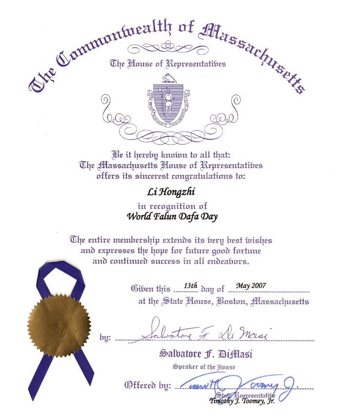 【明慧网二零零七年五月十三日】马萨诸塞州众议院五月十三日发布公告褒奖法轮大法。褒奖全文如下: