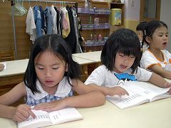 【明慧网二零零七年五月十三日】「心存真善忍,法轮大法成;时时修心性,圆满妙无穷。」童稚的读书声回荡在明慧豆豆园教室的一隅,看到一群二至五岁的小娃儿,正聚精会神的指着书上的字,一字一句的念着《洪吟》,那股认真劲儿,直让人觉的这个幼儿园与众不同。