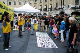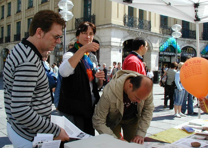 在向民众介绍法轮大法的同时,法轮功学员也介绍了法轮大法在世界洪传以及在中国受到中共迫害的情况。当人们看到如此祥和的功法在中国受到禁止和打压,均表示不可思议,不少人毫不犹豫的在制止中共摘取法轮功学员器官和呼吁营救德国法轮功学员张震彤的妻子王晓艳(王晓艳现被非法关押在中国的劳教所)的签名单上签名。