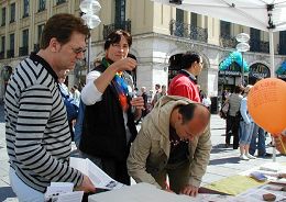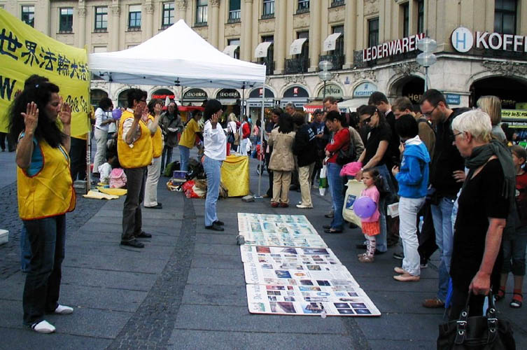 法轮功学员在慕尼黑的卡尔斯广场挂起了“世界法轮大法日”、“普天同庆”等横幅,向市民和游客介绍法轮功,向人们赠送印有“法轮大法好”字样的气球和学员精心制作的小莲花。不少民众被法轮功学员优美的炼功动作所吸引,前来了解什么是法轮功,也有不少人打听炼功点的情况,希望能就近学炼法轮功。