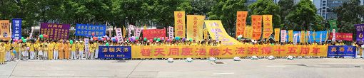 数百名香港法轮功学员,五月十三日举行大型炼功、游行及集会的系列活动,恭贺法轮大法师尊华诞暨法轮大法洪传十五周年,庆祝第八届世界法轮大法日。