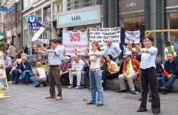二零零七年五月十二日,奥地利法轮功学员在维也纳市的施蒂芬广场上设立信息台,举办图片展,欢庆即将到来的第八届法轮大法日。