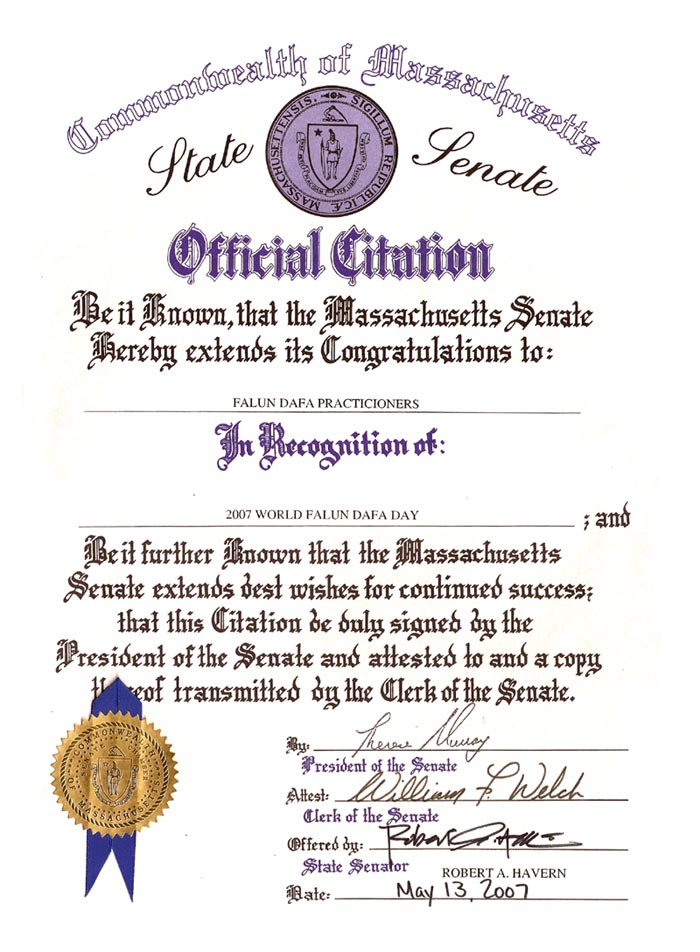 麻州参议院献上最美好的祝愿,祝不断取得成功。此褒奖状由参议院主席签署并由参议院秘书作证明和传递。