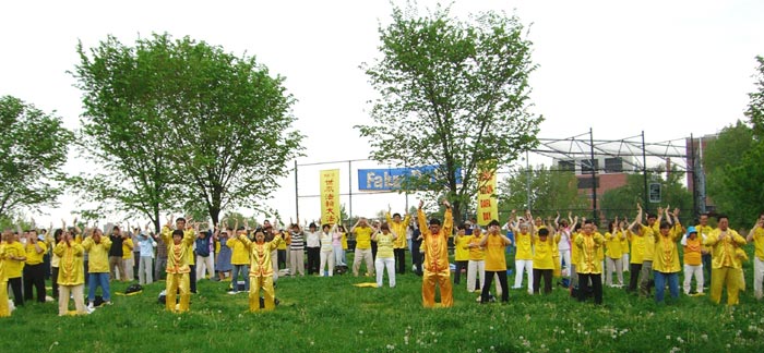 百余名法轮功学员或穿着印有“法轮大法”的黄色T恤,或穿着炼功服,或便服,在草坪上,随着音乐炼五套功法,场面宁静祥和。背景是“法轮大法”大横幅,两侧是中英文竖幅“5•13,世界法轮大法日”。“法轮大法好”、“真善忍”、“法轮大法免费教功”、“法轮大法洪传世界”等中英文横幅,悬挂在公园两侧。