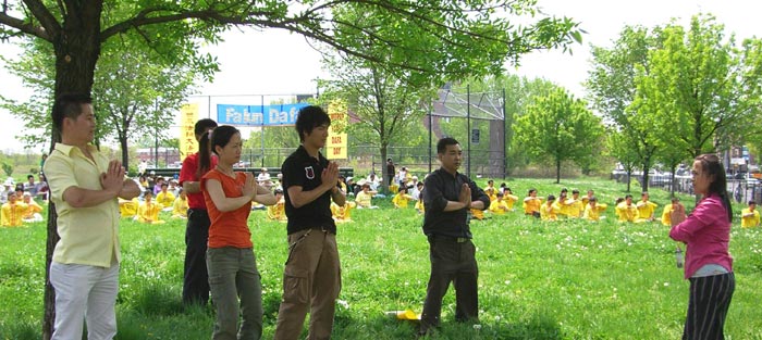 ![]() 法轮功学员在纽约法拉盛的公园集体炼功,祝贺大法洪传十五周年 |