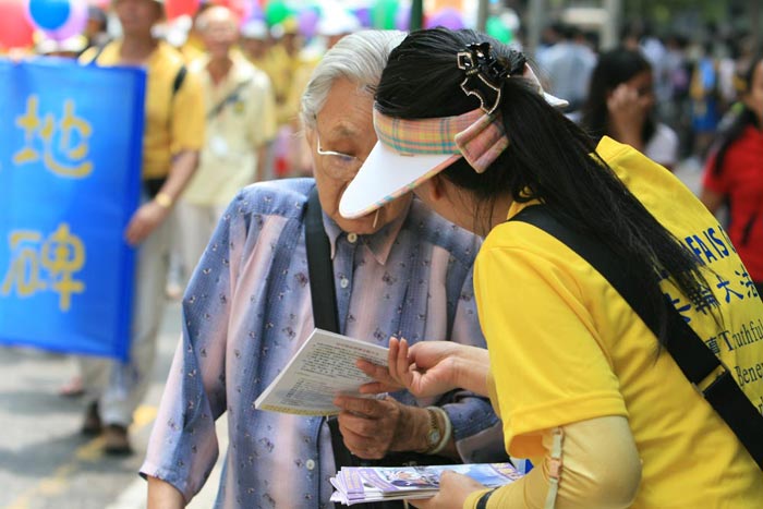 香港民众对庆祝法轮大法日的活动表示欢迎,昨日游行沿途,不少路人都接过了法轮功学员派发的真相材料,许多旁观的民众都对游行队伍报以微笑,更有人追问学员哪里可以学到法轮功。有些市民看到学员的庆祝活动,向身旁的友人侃侃而谈,说法轮大法如何在世界各地洪传。