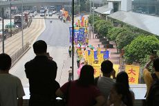 ![]() 庆祝大游行的队伍走在港岛区的主要道路上 |