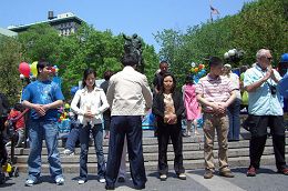 有二十多位中国民众早早来到联合广场,希望更多的了解法轮功,学习法轮功功法。法轮功学员耐心教他们功法的同时也告诉了他们三退的意义,劝他们三退。他们都很爽快,纷纷写下姓名,退出和中共有关的一切组织。