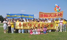 学员们在公园挂起了写有“法轮大法好”、“世界法轮大法日”等横幅及色彩鲜艳的气球,公园里充满了祥和、欢乐的气氛。