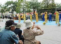 女王广场位于横滨市的中心,坐落于著名的横滨中华街附近,各种购物及游乐设施,吸引着大量的日本人与外国人来这里游览,观光。川流不息的人群今天都被大法弟子们丰富而精彩的演出所吸引,不由自主的停下脚步站在广场的四周观看表演。