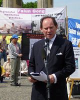 他呼吁各国应该站出来支持法轮功,要看清中共不可避免的会被清算的下场,他说:“中国被一个独裁、野蛮和残忍的政权所统治。对信仰的迫害将很可能导致中共的倒台,就象宗教导致了共产党在东欧的解体。我们今天站在曾象征欧洲分裂的柏林墙前,我们只能希望,为了成千上万、甚至百万被关在劳教所的中国人,中共政权能尽快倒台。另外,世界上的其它国家,都应该支持遭受中共迫害最严重的法轮功学员。”