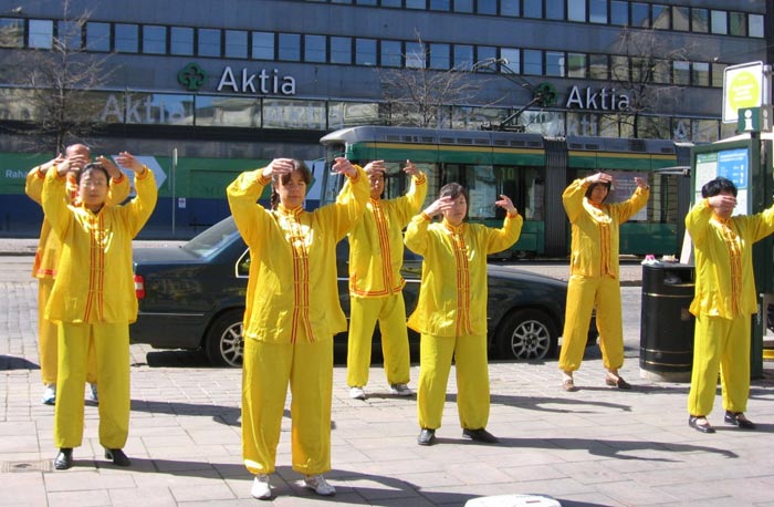 ![]() 身穿鲜亮黄色中国服饰的学员向民众演示法轮功的五套功法 |