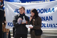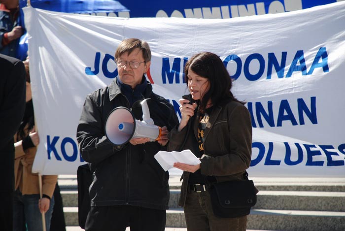 芬兰绿党议员奥缇•阿兰蔻-卡西罗东(Outi Alanko-Kahiluodon) 到场发表演讲。她说,在北欧各国,所有非政府组织,甚至那些反对政府的,都受到很好的照顾。他们甚至能够得到政府的经济资助。但是,这种社会对民主支持的理念,在中国只能是一种梦想。在那里,维权人士仅仅因为自己的生活与人权,为社会发展站出来,就被投入监狱。在中国监狱里,关押着那些站出来反对中国政府侵犯人权的人。反抗的声音被压制下去,中共把所有人民封闭在国家的疆界内,网页被封锁,人民的生活被监视。甚至(芬兰)绿党青年组织的网页也无法被中国人民看到。也许支持人权,环境绿化,或对独裁有反对思想,都被中国政府视为一种威胁。
