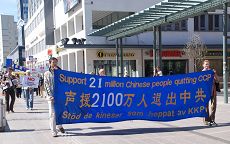 集会结束后,由警车开道,身穿中式运动服装的腰鼓队领头,随后人们举着各种声援退党的横幅与标语牌,在赫尔辛基闹市区进行了游行。
