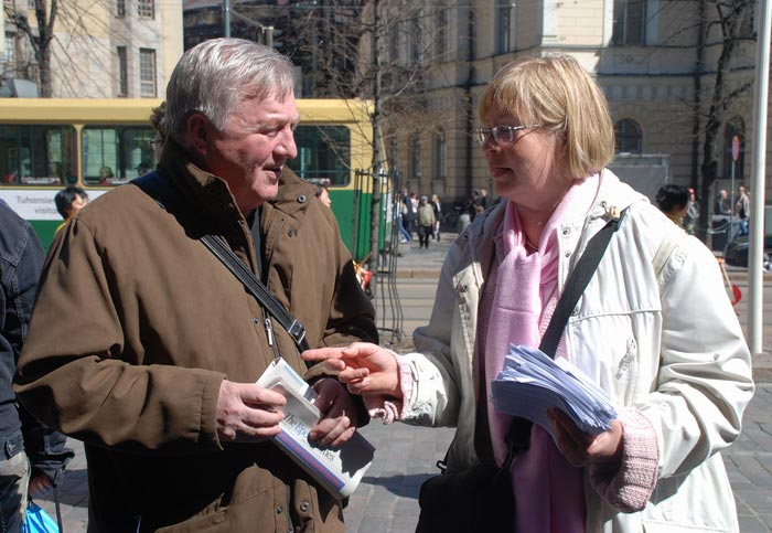 《大纪元时报》代表皮尔尤•斯万森 (Pirjo Svensson) 介绍,自从《大纪元时报》系列社论《九评共产党》发表以来,由于越来越多的人认识到中共的邪恶本性,在中国引发了退党大潮。中共灭亡在即。皮尔尤•斯万森说,最近,芬兰语的《九评共产党》马上就要出版了。这也将能使芬兰人民更理解与支持中国的民主进程。