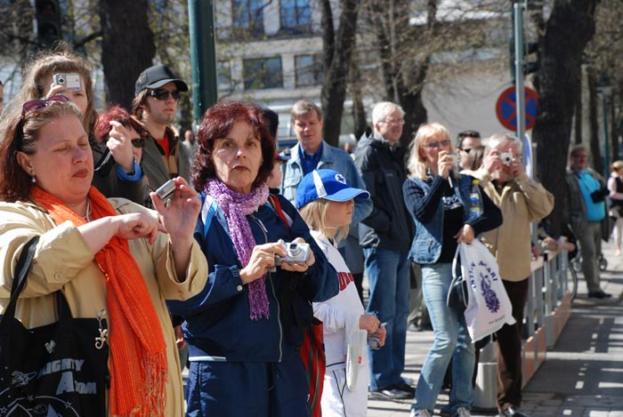 今天,由于一年一度的欧洲歌曲大赛决赛也将在今天见分晓。来自北欧各国爱好音乐的人们,也纷纷来到这里,亲历决赛结果公布的扣人心弦的那一刻。因此市中心人非常多。鼓声阵阵,游行民众喜气洋洋,庆祝中国所发生的退党大潮。游行吸引着大量群众观看。有的人远远听到鼓声,口号声,马上从马路的另一边跑过来观看。