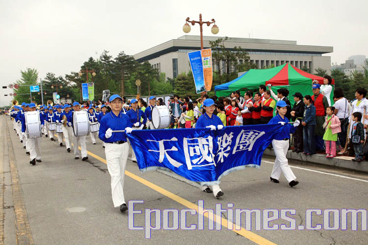 大会主持人介绍说:“天国乐团是由法轮功修炼者组建的军乐队,法轮功是一个以‘真、善、忍’为宗旨的身心修炼功法。天国乐团在世界各地多个城市参加过游行活动,他们今天演奏的曲目是‘法轮大法好’、‘法正乾坤’等。”