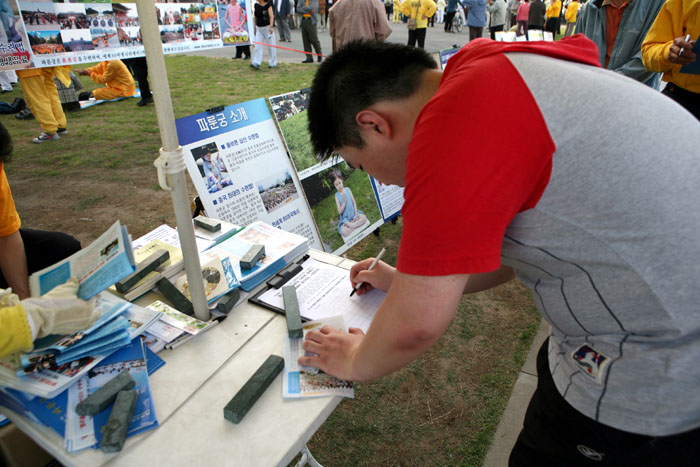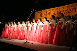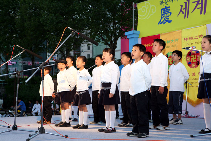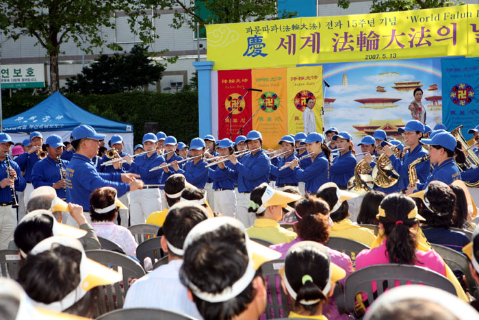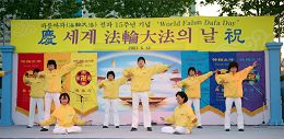 【明慧网二零零七年五月十七日】二零零七年五月十三日,韩国法轮功学员为庆祝法轮大法洪传世界十五周年,在南部城市大邱举办庆典活动。大邱是韩国传统文化保存最好的城市,也是除了首尔之外法轮功修炼者最多的城市。傍晚时分在大邱新川河边的市民公园,庆祝活动吸引了大批大邱市民。