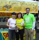 法轮功学员参加了摊位展示,精心布置的展位上中英文“法轮大法好”和“真善忍”的字样格外醒目。学员们还在摊位四周摆放了展示大法洪传的展板。身着金黄色炼功服演示功法的法轮功学员舒缓优美的动作和炼功音乐不断的吸引游客们驻足观看和询问。在一旁散发真相材料的学员向有缘人介绍功法的特点和中共迫害法轮功的真相。