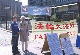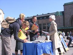 芬兰学员Sinikka让小儿子Samuli帮她拿着高音喇叭,她则一遍遍的向过往行人讲述着什么是法轮功以及中共对法轮功修炼者残酷迫害的真相,同时也告诉人们赫尔辛基的炼功点的地址和时间。就看到一位女士听着讲解,手随着演示功法的学员比划着炼功动作。