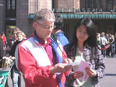 学员刚竖起展板、支起征签桌,就有几位年轻人过来签名声援反迫害并向学员了解真相,原来这群年轻人是大赦国际的志愿人员,当天也在火车站旁活动。活动中又来了一位大赦国际的志愿人员,说今天已有好几个人向她了解法轮功目前在中国的现状,所以她要更多的了解一下法轮功的情况,以便回答人们的提问。