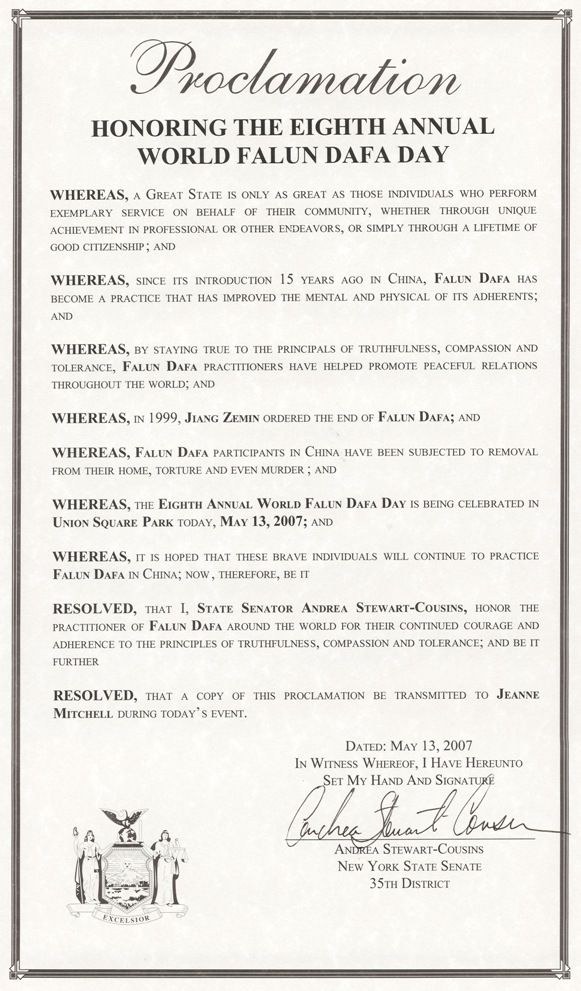 鉴此,现在决定,我,安德里亚•斯图雅特-卡莘(Andrea Steuart-Cousins),州参议员,褒奖世界各地的法轮大法修炼者们,表彰他们的勇气和对真、善、忍的坚信;
