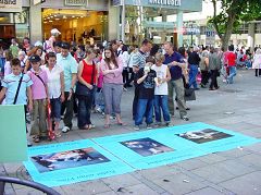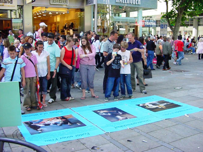 上午的活动进展的有些困难,因为球迷们吹着喇叭,喝着啤酒,高声嬉笑,似乎很难静下心来关心发生在中国的迫害。只有比例较少的过路人愿意了解真相。但是情况在下午球赛结束后发生了转变,人们都被真相展板和铺在地上的三幅逼真的画所吸引了。一位德国妇女问,这样做是否可以改变什么,法轮功学员说会的,已经有了不少成功的案例。她说政治家只想和中国做生意,他们不会做什么的。这时过来了两个德国男士和她争辩起来,他们认为德国应该采取经济制裁来向中共施压。
