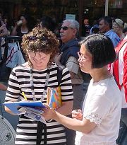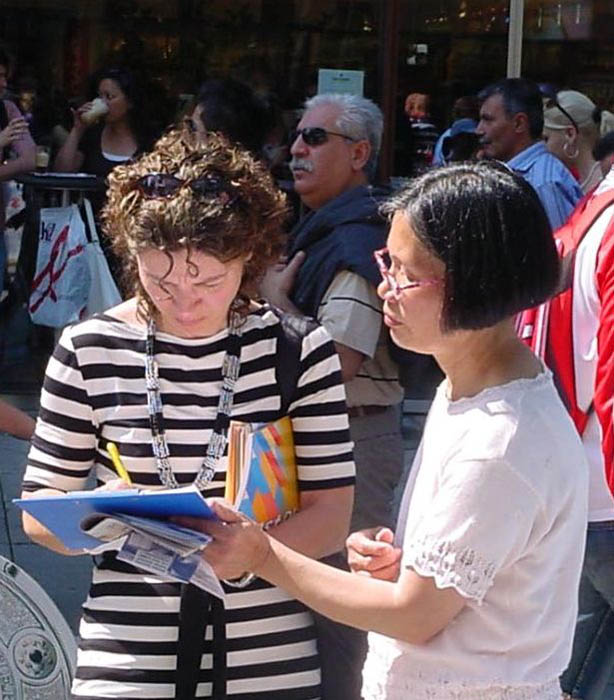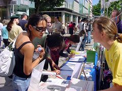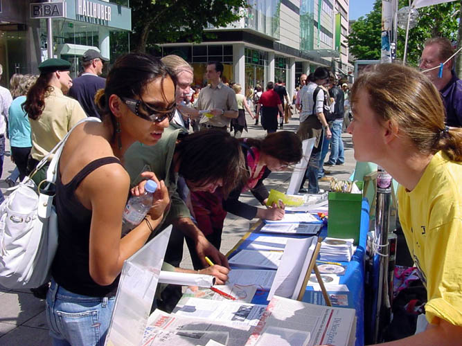 反迫害征签活动进行的非常顺利,绝大多数被问及的行人都愿意签名,因为他们为中共活摘法轮功学员器官的残酷事实感到震惊和难过。一位不能说话,也听不到声音的老者在读了征签表的内容后签上了他的名字。一位年轻的姑娘说她在温哥华看到法轮功学员表演的舞蹈,她认为这是一个和平的群体,不应该被迫害。她身边的小伙子说,他还在网上读过《转法轮》这本书。他们也都签名反迫害,并说很高兴看到法轮功学员们在这里。两个女中学生高兴的索取了德文“九评”和其它的资料,因为她们正在做一个有关中国的研究项目。