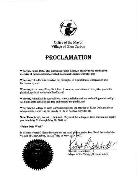 鉴此,我,格林卡班(Glen Carbon)市长Robert L. Jackstadt宣布二零零七年五月二十一日至二十八日为: