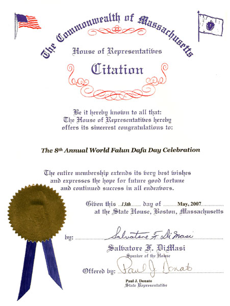 【明慧网二零零七年五月二十四日】马萨诸塞州众议院议长迪马西五月十三日发布公告褒奖世界法轮大法日。褒奖全文如下: