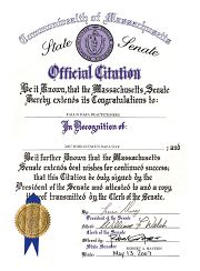 麻州参议院献上最美好的祝愿,祝不断取得成功。此褒奖状由参议院主席签署并由参议院秘书作证明和传递。