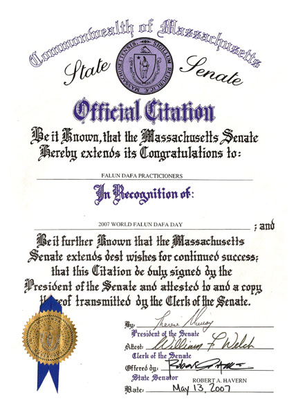 【明慧网二零零七年五月二十四日】马萨诸塞州参议院五月十三日发布公告褒奖第八届世界法轮大法日。