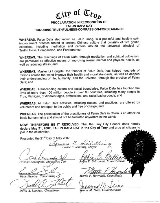 有鉴于此,特洛伊市市议会郑重宣布二零零七年五月二十一日为特洛伊市“法轮大法日”,并敦促所有市民共同庆祝。
