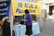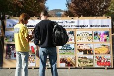 学员们告诉游客,法轮功从一九九二年传出,已经十五年了,在全世界各地广泛受欢迎,唯独在中国大陆自一九九九年起受到严酷打压。法轮功学员本着真善忍的精神,向各阶层讲真相,呼吁制止残酷的迫害。这些图片都是法轮功修炼者的亲身经历,他们修炼后的精神升华,以及面对迫害坚忍不屈的精神,体现了他们修炼后的崇高境界。