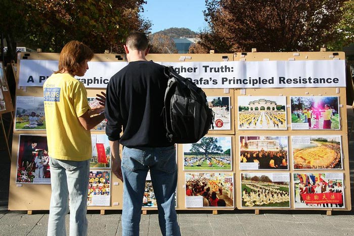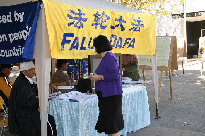 【明慧网二零零七年五月二十六日】(明慧记者蕴韵堪培拉报导)二零零七年五月十二日,澳洲堪培拉法轮功学员在市中心举办法轮功真相图片展,并在市中心揭露中共对法轮功的残酷迫害。许多游客看了图片后,了解到中共活体摘取法轮功学员器官的罪行,感到中共太可怕、太邪恶了,法轮功学员在巨大的魔难中仍然坚定信仰的精神令人钦佩。观众对画展给予了高度评价,都表示支持法轮功学员反迫害。