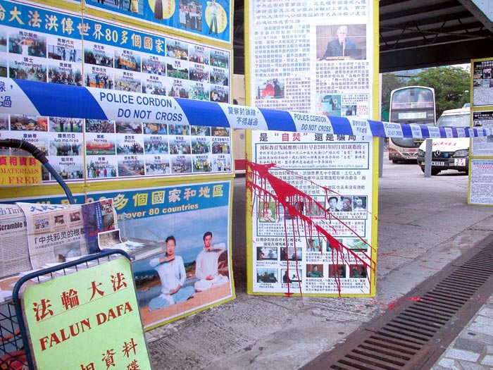 【明慧网二零零七年五月二十六日】香港法轮功学员在著名旅游热点开设的一个真相展示点,二零零七年五月二十四日下午遭到两名凶徒暴力袭击破坏。在同一天上午,附近的退党服务点也遭人捣乱。法轮功学员指出,袭击事件显然是由中共特务势力策划与指挥,显示中共死党迫害法轮功注定失败之后,在濒临解体前的末日疯狂。