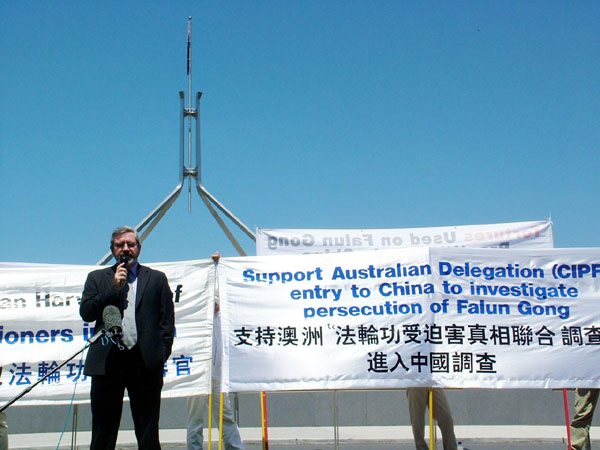 【明慧网二零零七年五月二十七日】二零零七年五月二十四日中午,“法轮功受迫害真相联合调查团”(简称CIPFG)的澳洲分团在堪培拉国会山庄前发布联合声明:奥运会和反人类罪行不能在中国同时发生,并向中共政权提出三点严正要求,明确指出如果中共政权不能在二零零七年八月八日前对诉求做出令人满意的回应,将在全球范围结合所有正义力量来共同抵制中共举办二零零八年的奥运会。