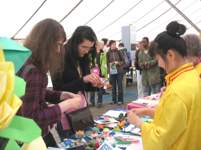 很多人对美丽的纸莲花很欣赏,亦有人当场学折。拿着莲花的很多人,也同时索要赫尔辛基炼功点的地址和时间,希望能学功。