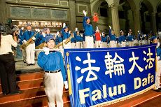 二零零七年五月二十六日周六晚间,台湾高雄县议会举办周末艺文活动,主办单位特别邀请法轮功学员所组成的「天国乐团」、「天威唐鼓队」现场表演。