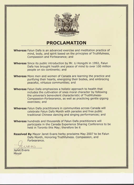 鉴此,我,素克市市长杰尼•埃文(Janet Evans ),特此褒奖二零零七年五月份为素克市“颂扬真、善、忍的法轮大法月”。