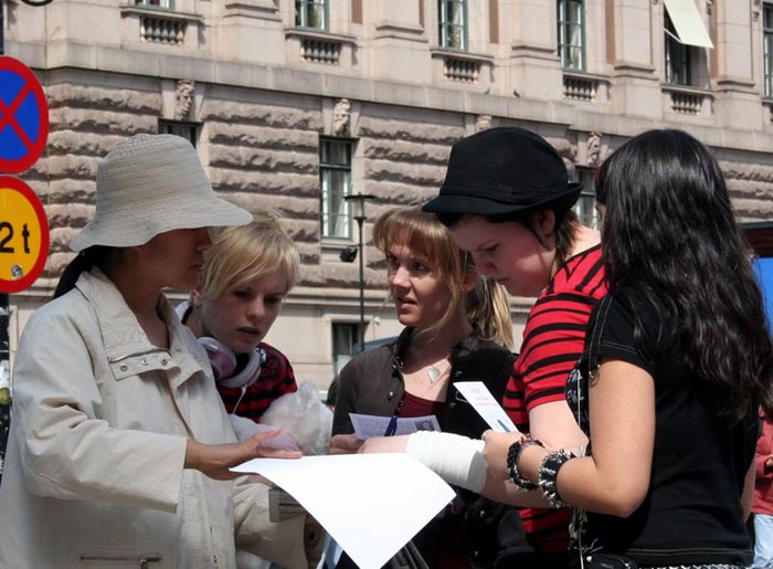 【明慧网二零零七年五月三十日】为了更广泛深入的向世人讲清中共迫害法轮功的真相,以及中共活体摘取法轮功学员器官并牟取暴利的恶行,从二零零七年五月二十六日上午开始,居住在瑞典首都斯德哥尔摩的部份法轮功学员走上了街头,开始了向民众面对面的讲真相,征集支持法轮功反迫害的签名。在斯德哥尔摩繁华地区的主要路口、旅游景点、地铁站等,处处可见三三俩俩的法轮功学员的身影。他们利用周末公休日和每天下班以后的空闲时间,用这种面对面的讲真相、征集签名的形式,向来来往往的过往行人发放法轮功真相材料,讲述中共活摘法轮功学员器官的残暴行径。并把超过两千两百万中国人退出中共相关组织的信息告诉世人。