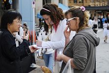 也有中国人路过看到了真相。有人对迫害事实还存有疑虑,法轮功学员真诚的送给他一本加拿大独立调查团所发布的《血淋淋的器官摘取----关于指控中共摘取法轮功学员器官的调查报告修订版》,希望他能多了解一些真相。